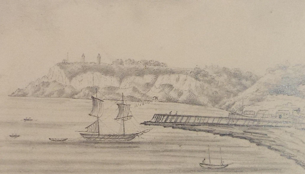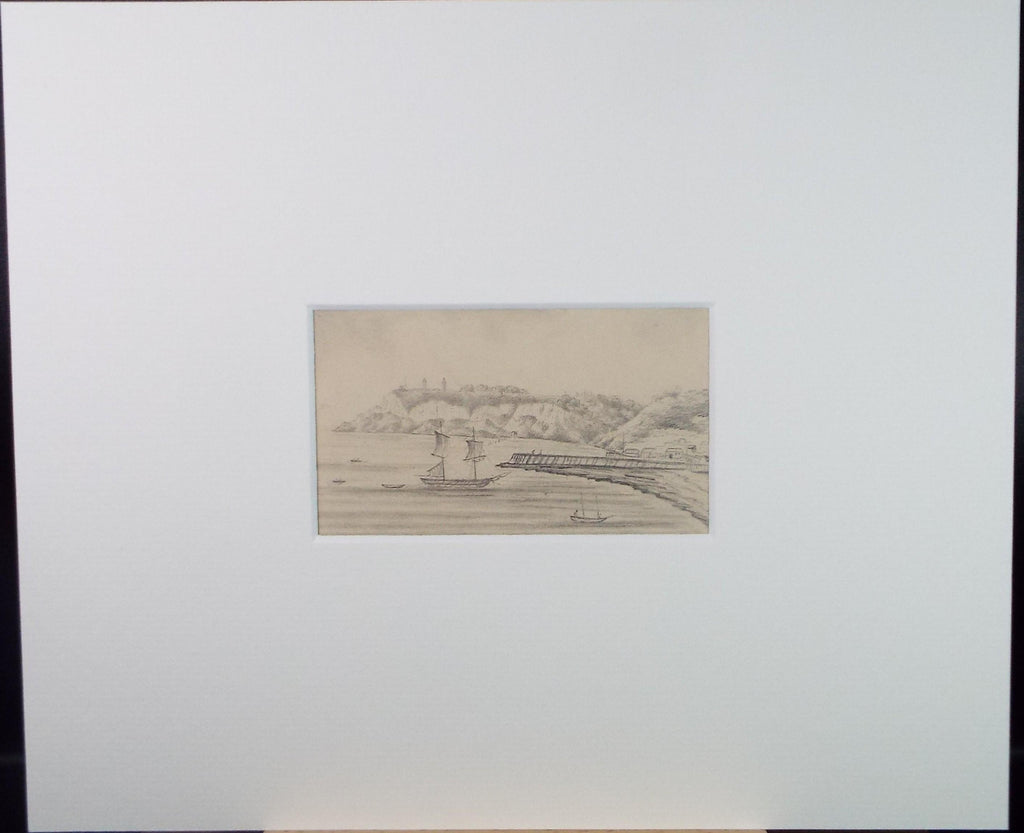 Antique Pencil drawing: Tall ship anchored, Late 19th Century