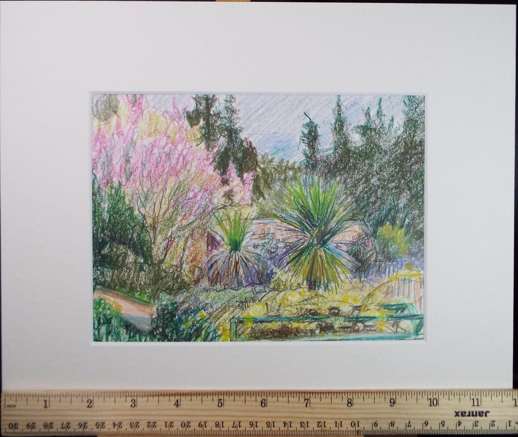 Coloured Pencil drawing 'Cottage Garden with Cordyline', Pauline Plummer (b1933), Circa 1990's
