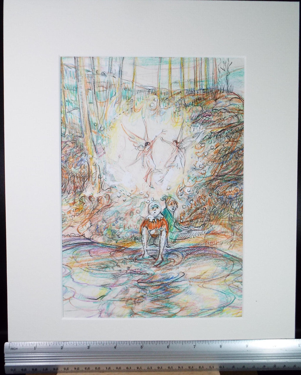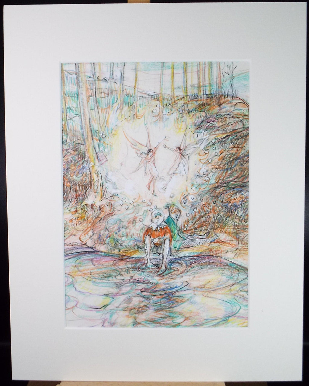 Original coloured pencil & Gouache,'Childen by a fairy pool', 2005, John Gilbey Bowles (1929-2011)