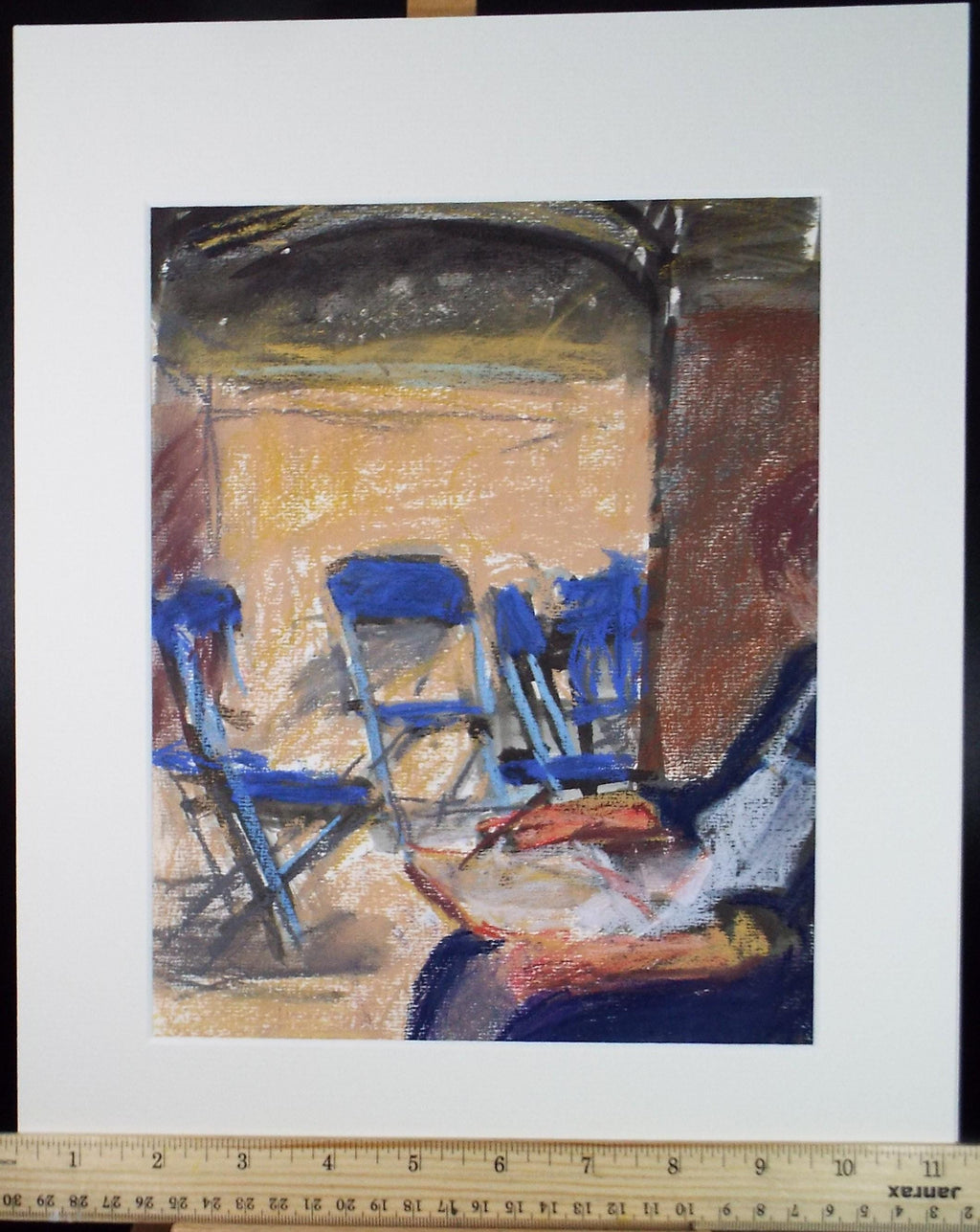 Original pastel drawing, 'figure with blue chairs', Pauline Plummer, 1990s