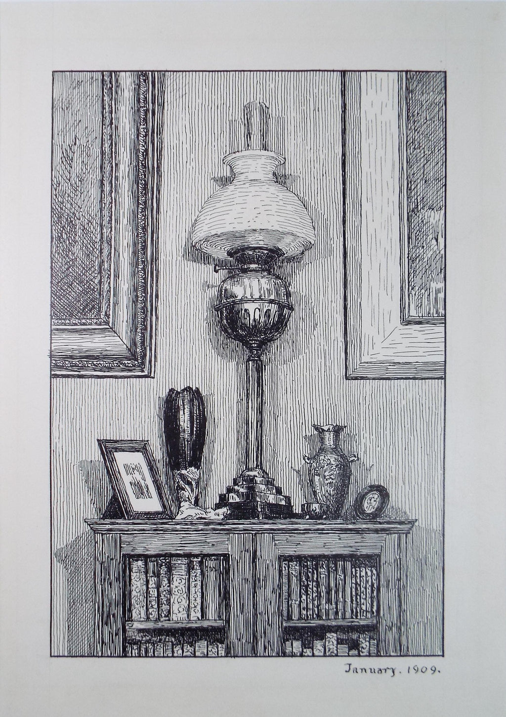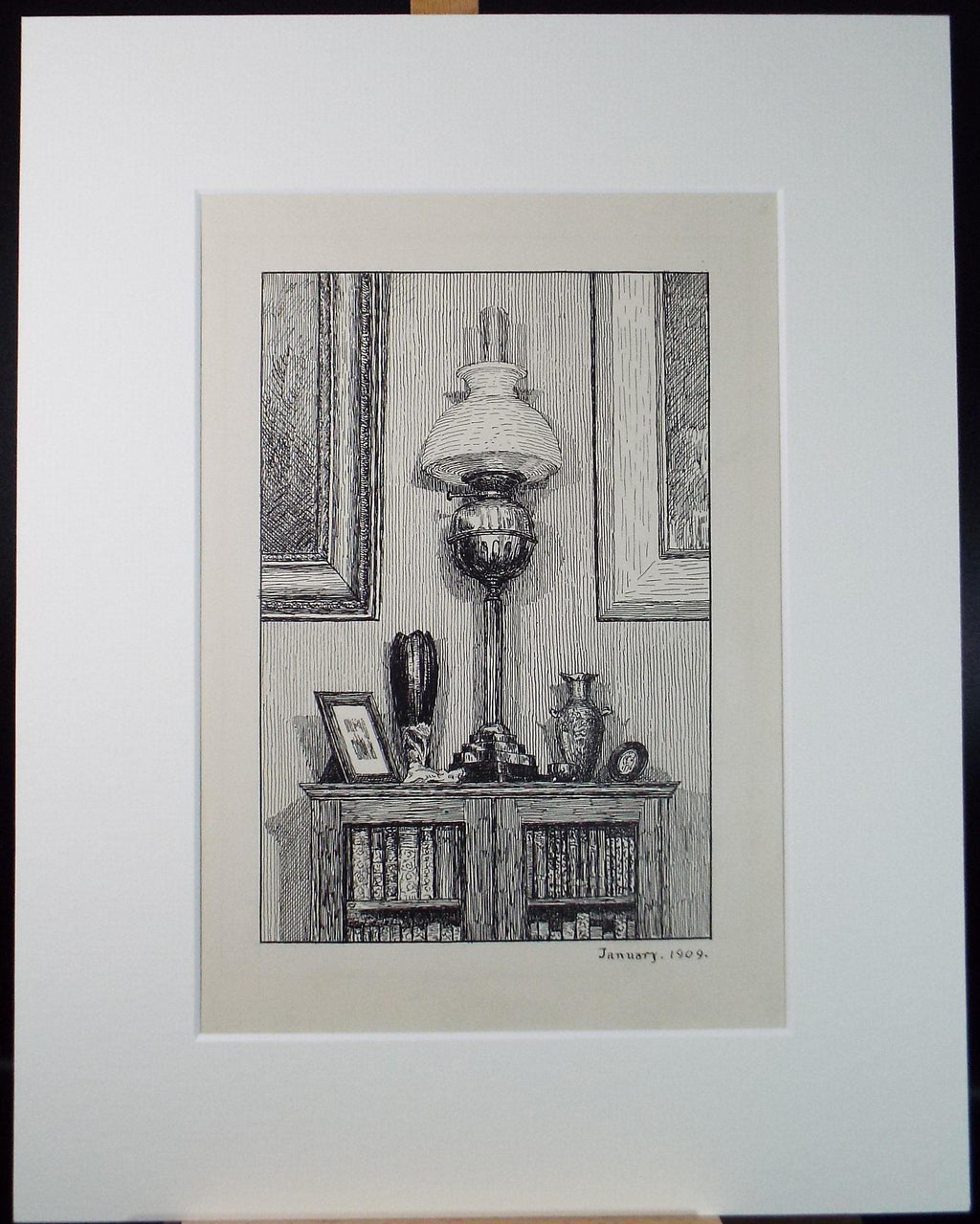 Original Pen & ink Sketch, 'Oil lamp on sideboard', S A Southern, Dated 1909