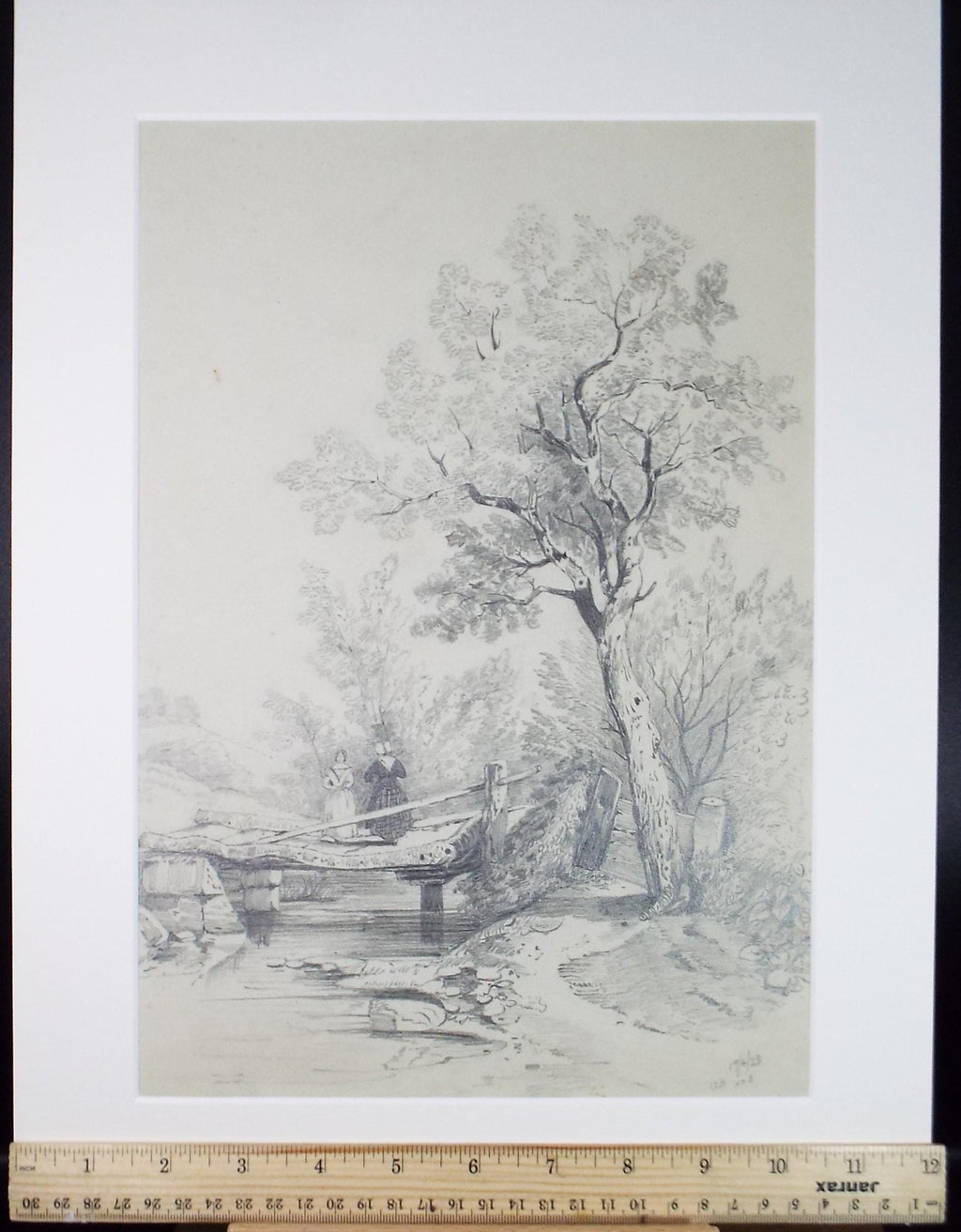 Original Pencil Drawing, 'Figures on a Bridge', Late 19th Century, Artist Unknown