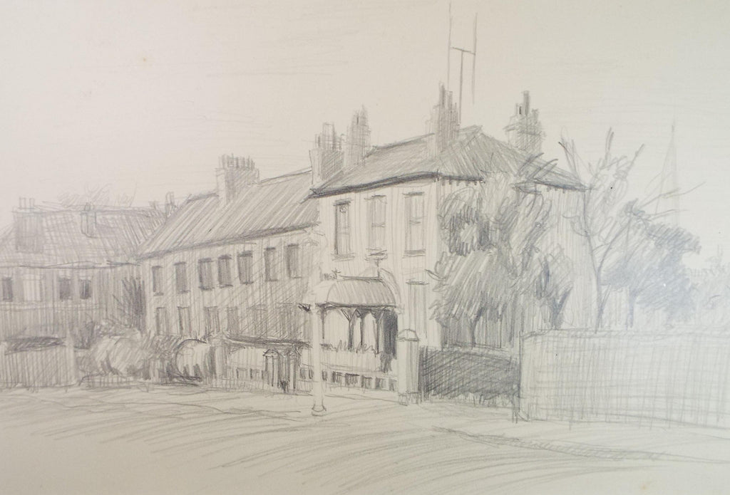 Original Pencil drawing 'Street Scene', Pauline Plummer (b1933), Circa 1950's