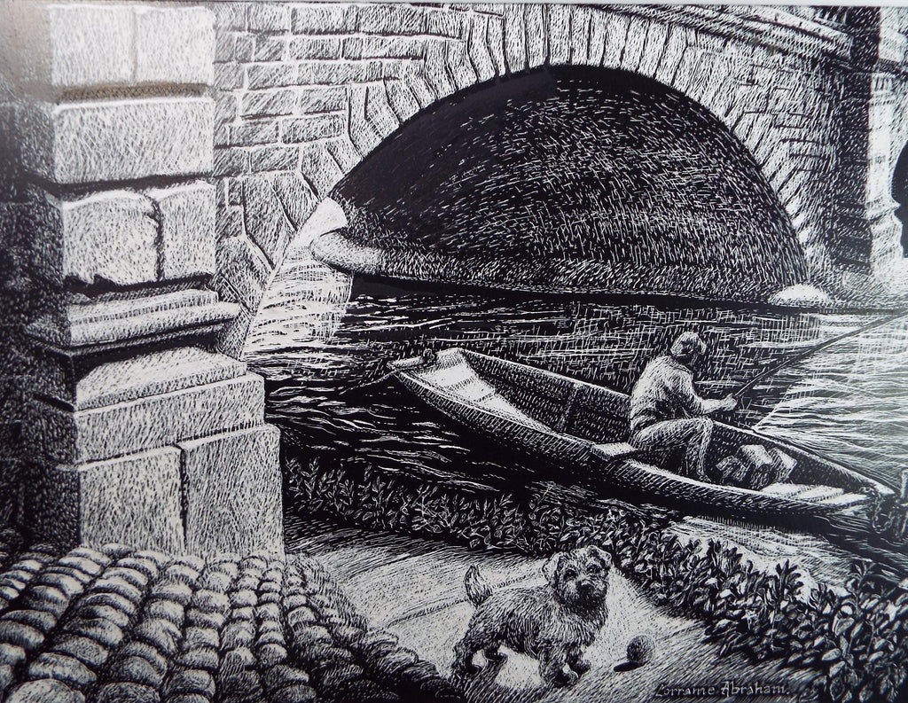 Original Scraperboard drawing, 'Fishing with a Terrier', Lorraine Abraham RSMA (1941-2023), Circa 1990's