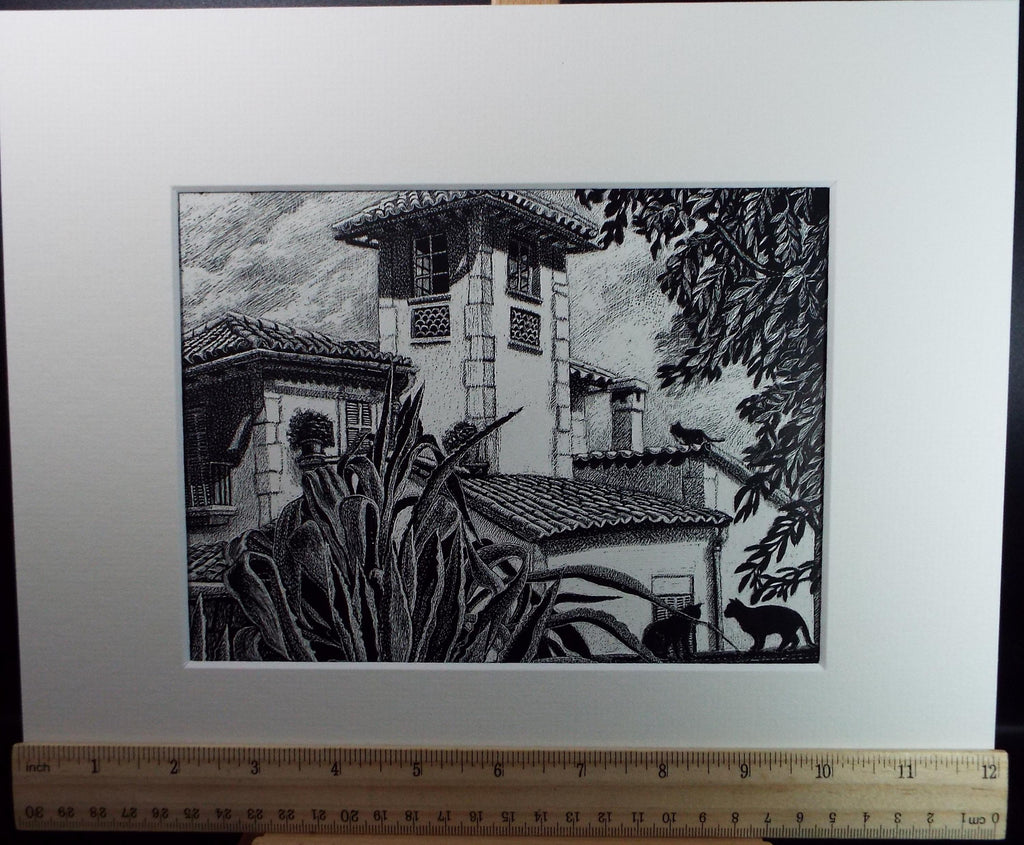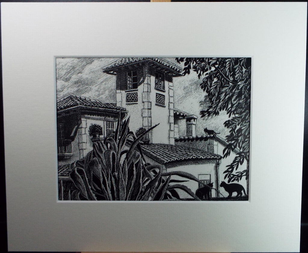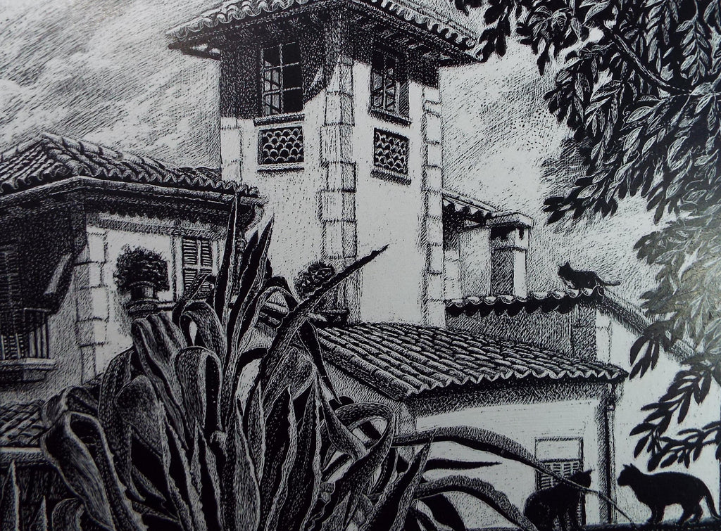 Original Scraperboard drawing, 'Villa with Cats', Lorraine Abraham RSMA (1941-2023), Circa 1990's