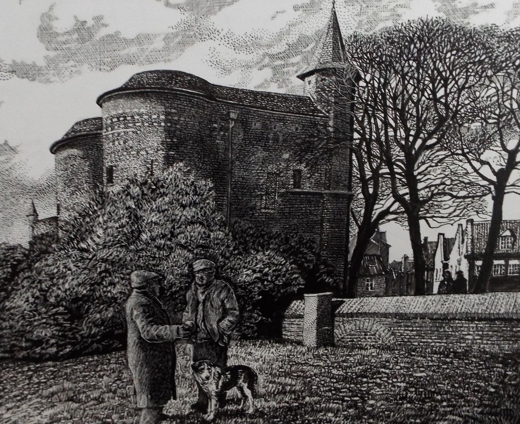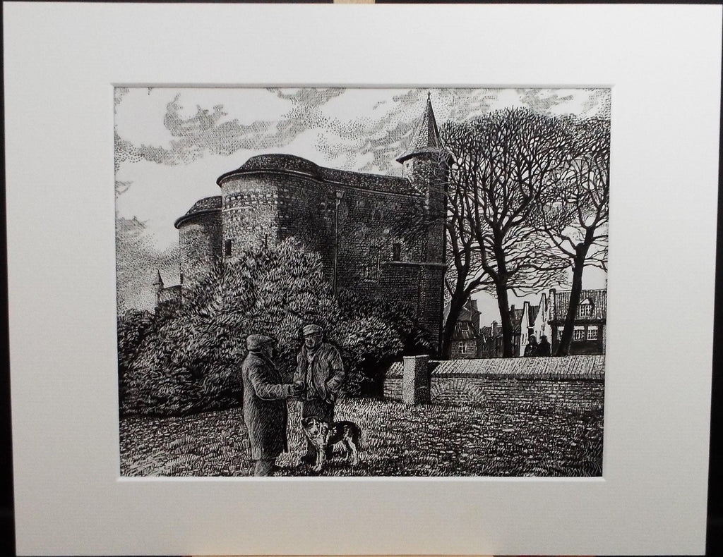 Original Scraperboard & Ink drawing, 'Figures with Dog, Lorraine Abraham RSMA (1941-2023), Circa 1990's