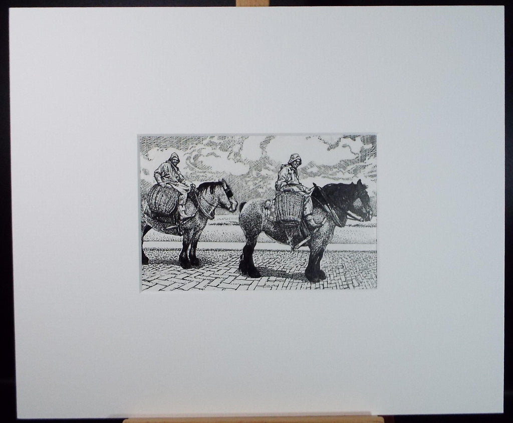 Original Scraperboard & ink drawing, 'Cockle Pickers', Lorraine Abraham RSMA (1941-2023), Circa 1990's
