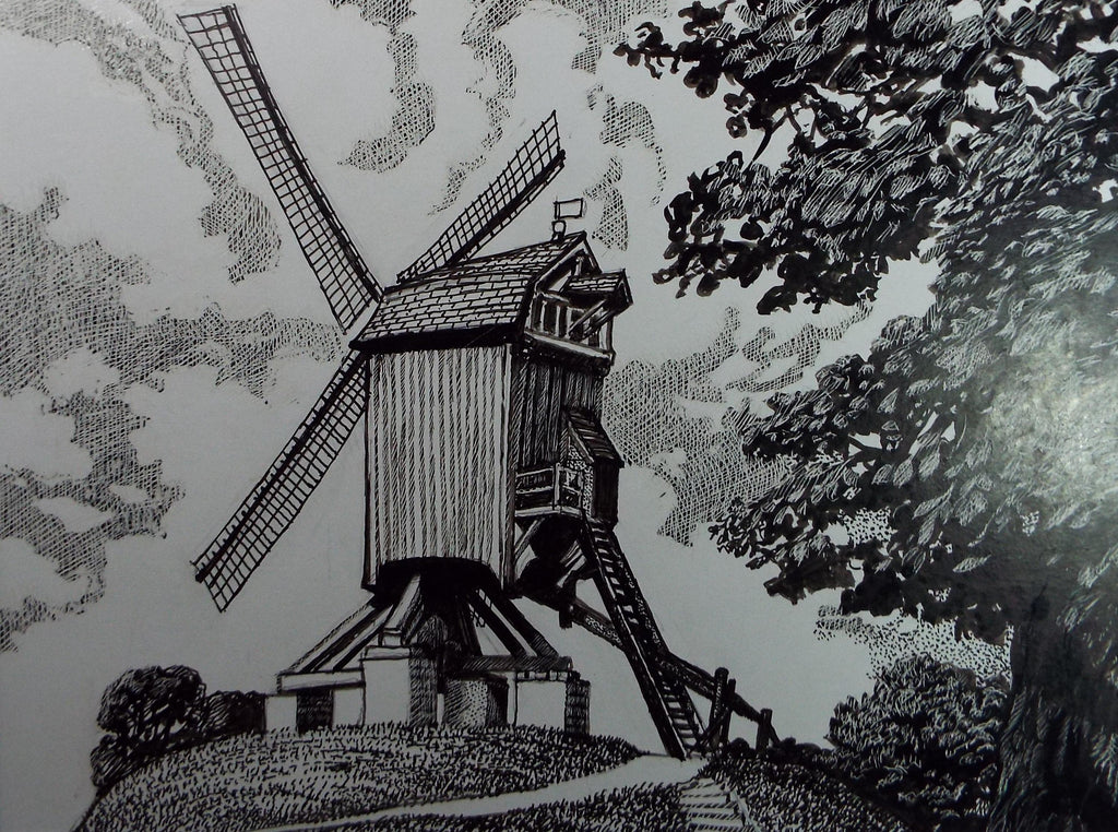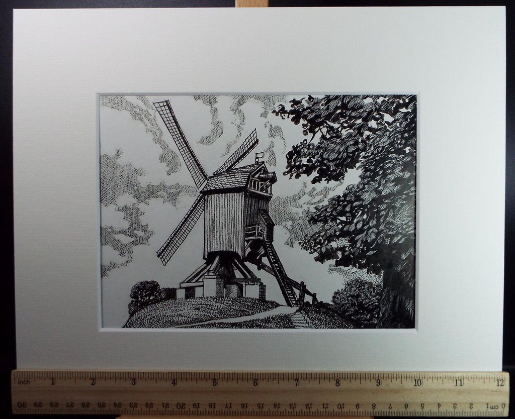 Original Scraperboard & ink drawing, 'The Windmill', Lorraine Abraham RSMA (1941-2023), Circa 1990's