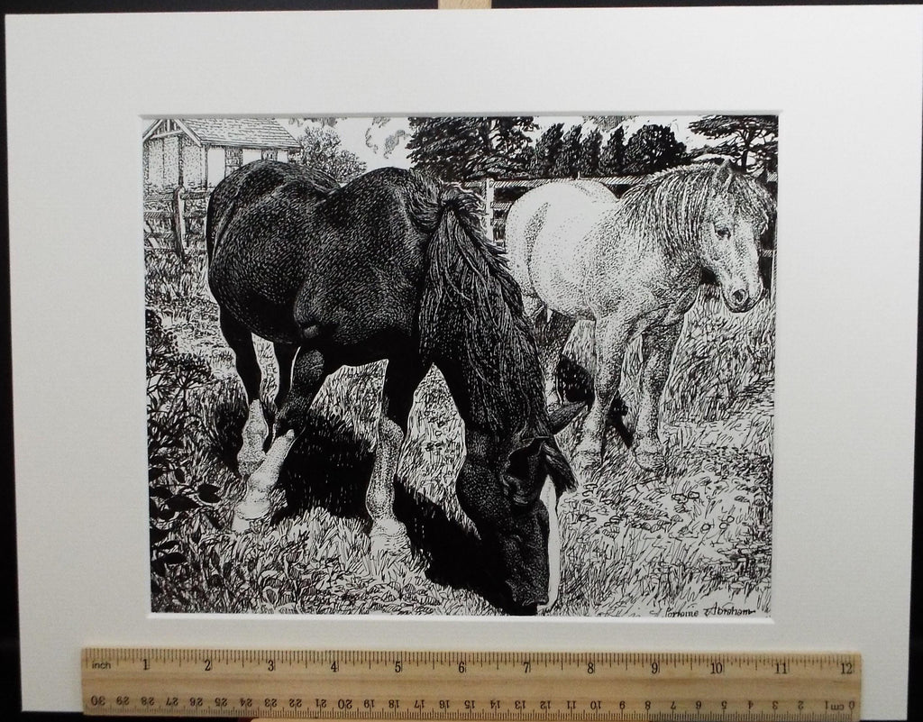 Original Scraperboard & ink drawing, 'Two Ponies', Lorraine Abraham RSMA (1941-2023), Circa 1990's