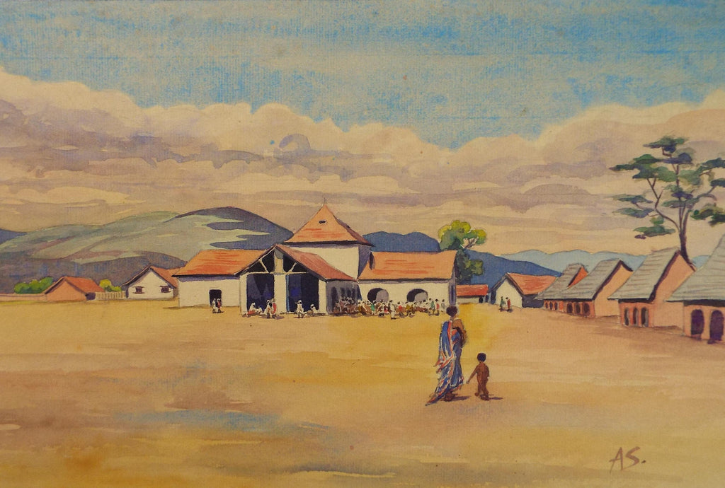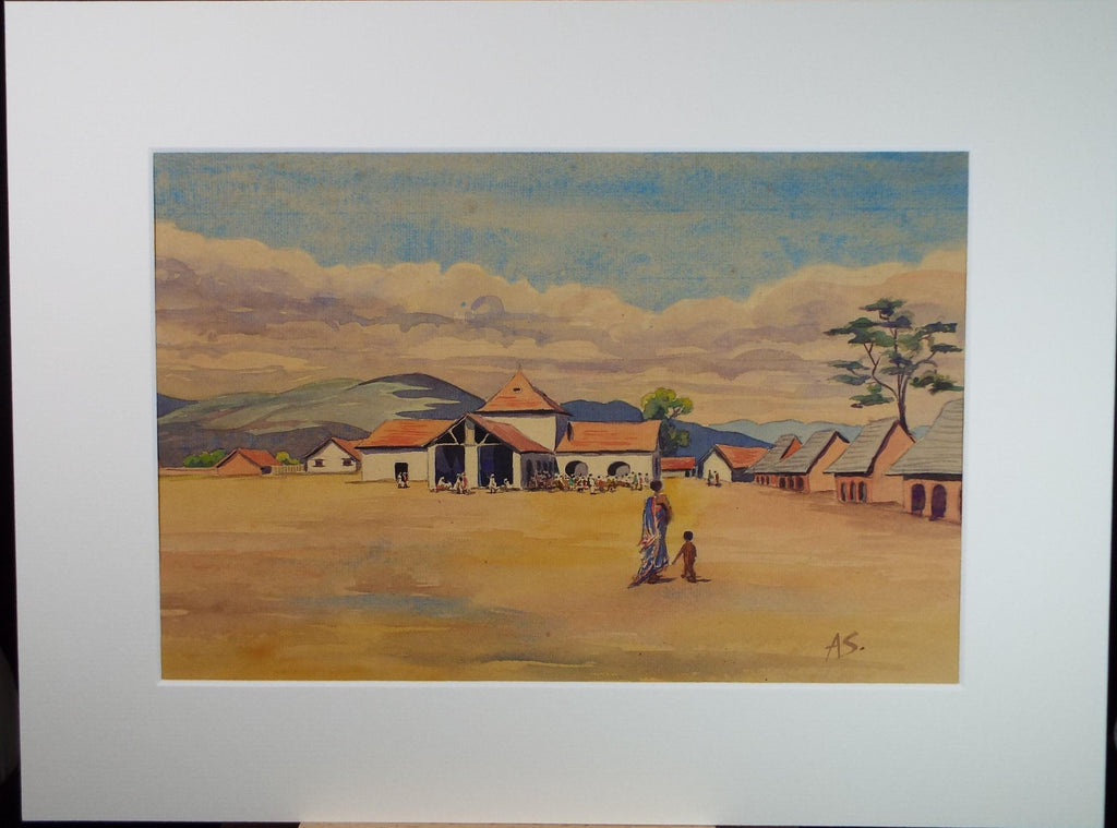 Original Watercolour, 'African village with figures', circa 1920's, Initialled A.S.