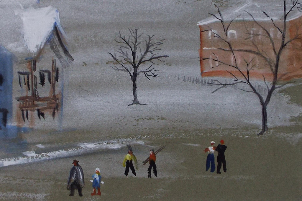 Original Watercolour, 'Alpine Village with Skiers;' c1930's, Unknown Artistt