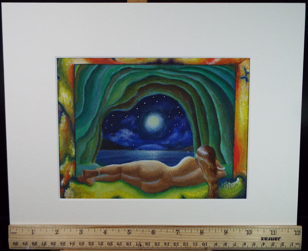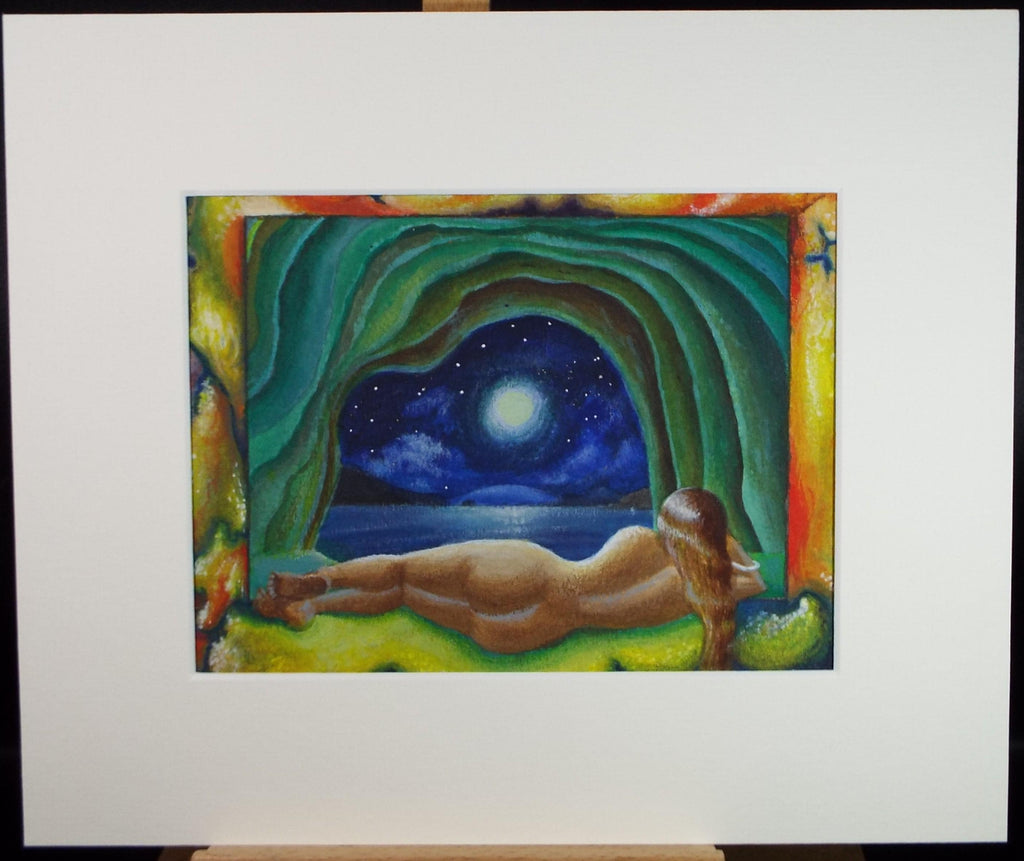 Original Watercolour, 'Cave with nude and moonlit sky', Circa 1990's, artist unknown