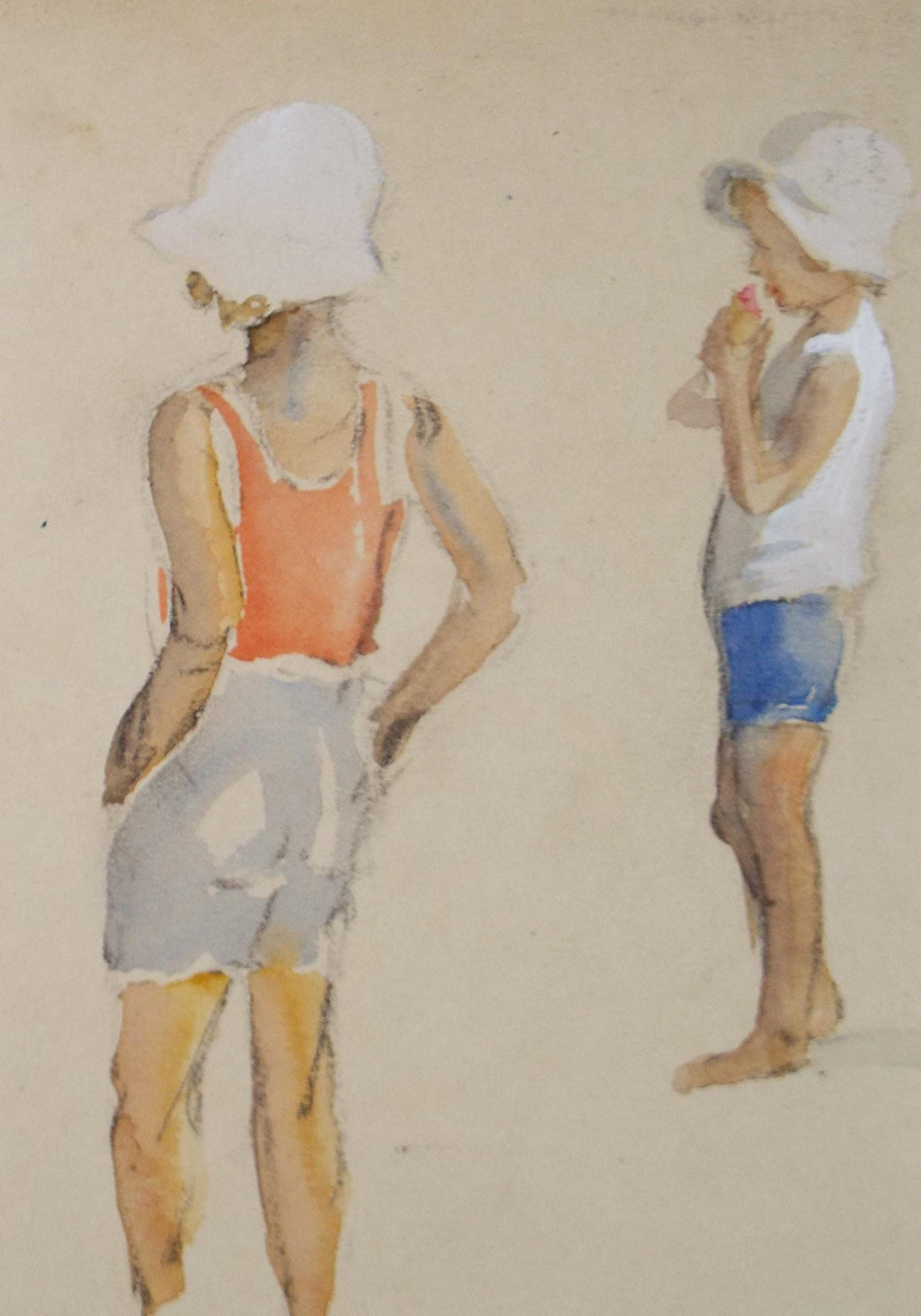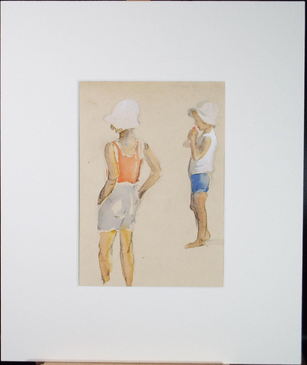 Original Watercolour, 'Children on the beach', circa 1930's, Artist Unknown