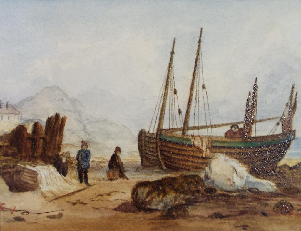 Original Watercolour, 'Figures and boats on the shore', late 19th Century, artist unknown