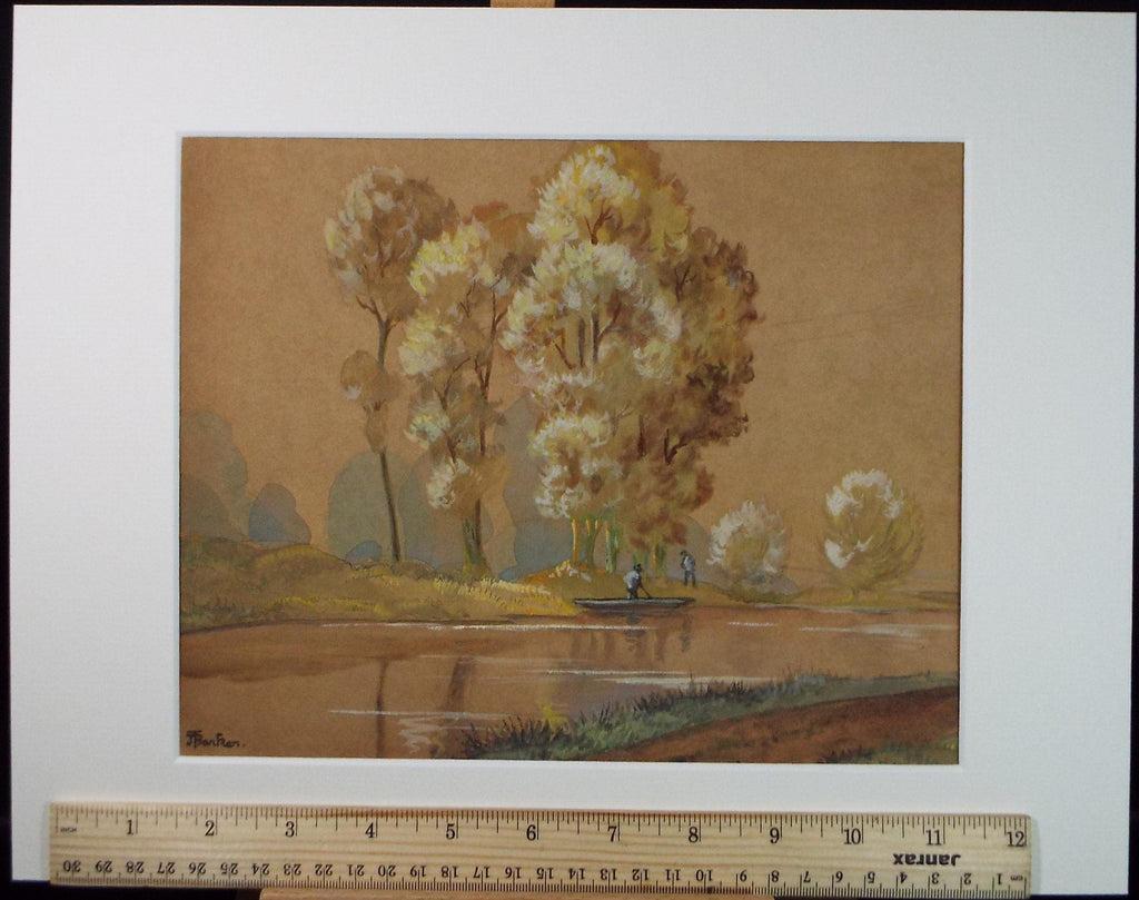 Original Watercolour & Gouache, 'Punting on the river', J Barker, circa 1930's