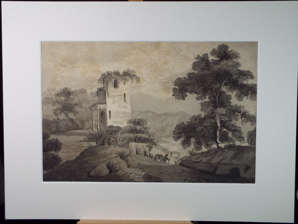 Original Watercolour, 'Landscape with Tower', Unknown Artist - Late 19th Century