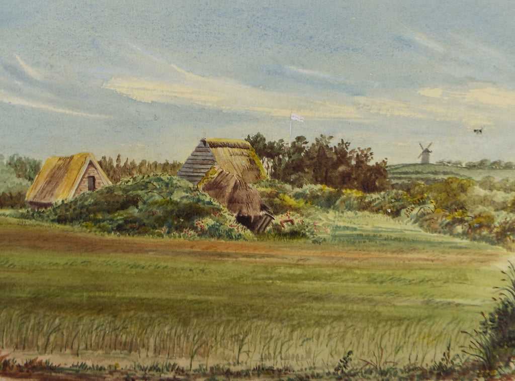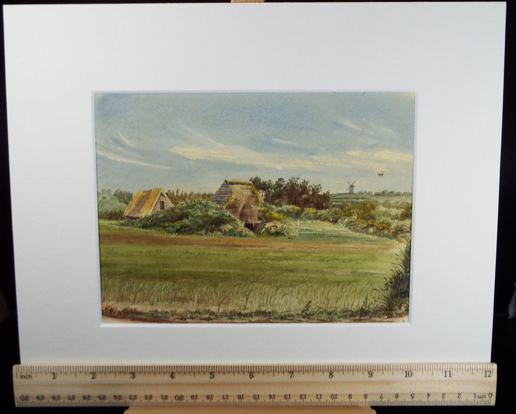 Original Watercolour on Paper, 'Barns with Distant Windmill', Late 19th Century, Artist Unknown