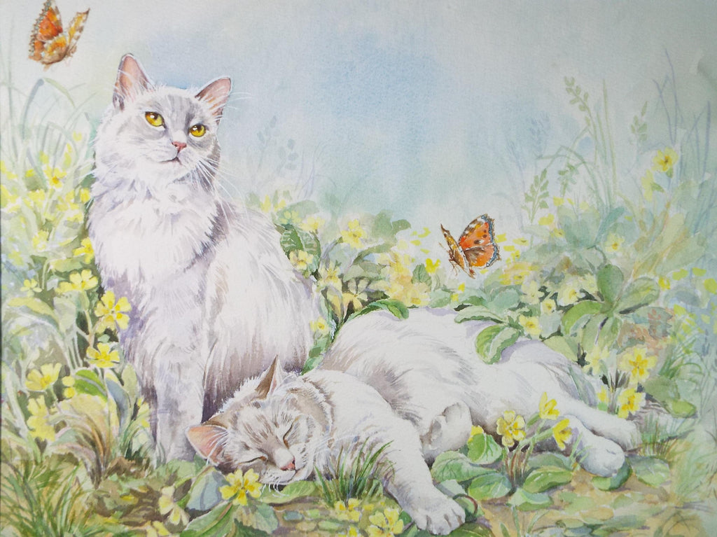 Original Watercolour, 'Prim & Rosie with Butterflies',P Martins s.o.f.a, Circa 1990's