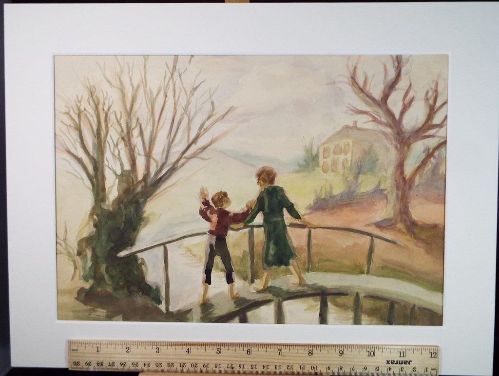 Original Watercolour, 'Two figures on a bridge', Pauline Plummer (b1933), Circa 1950's