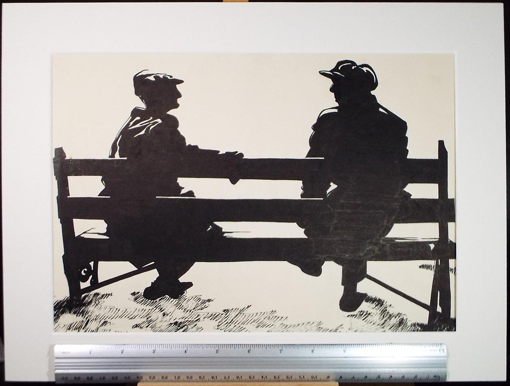 Original Watercolour, 'Two men on a bench - Silhouette', unknown artist, Circa 1970's