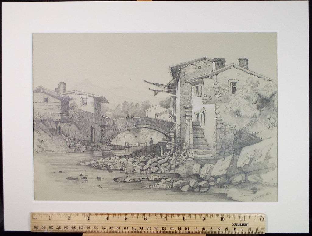 Pencil Drawing, 'Figures on a Bridge', Dated 1878, Artist Unknown