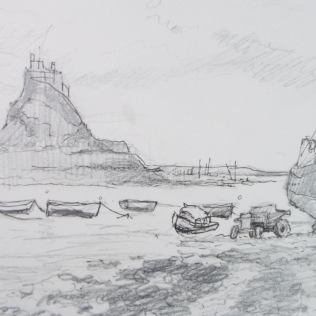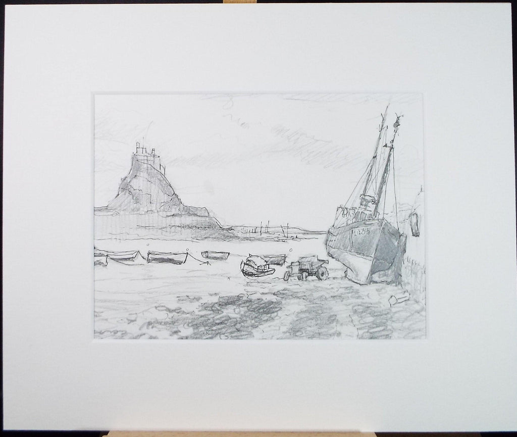 Pencil drawing 'Lindisfarne with boats', Pauline Plummer (b1933), Circa 1990's