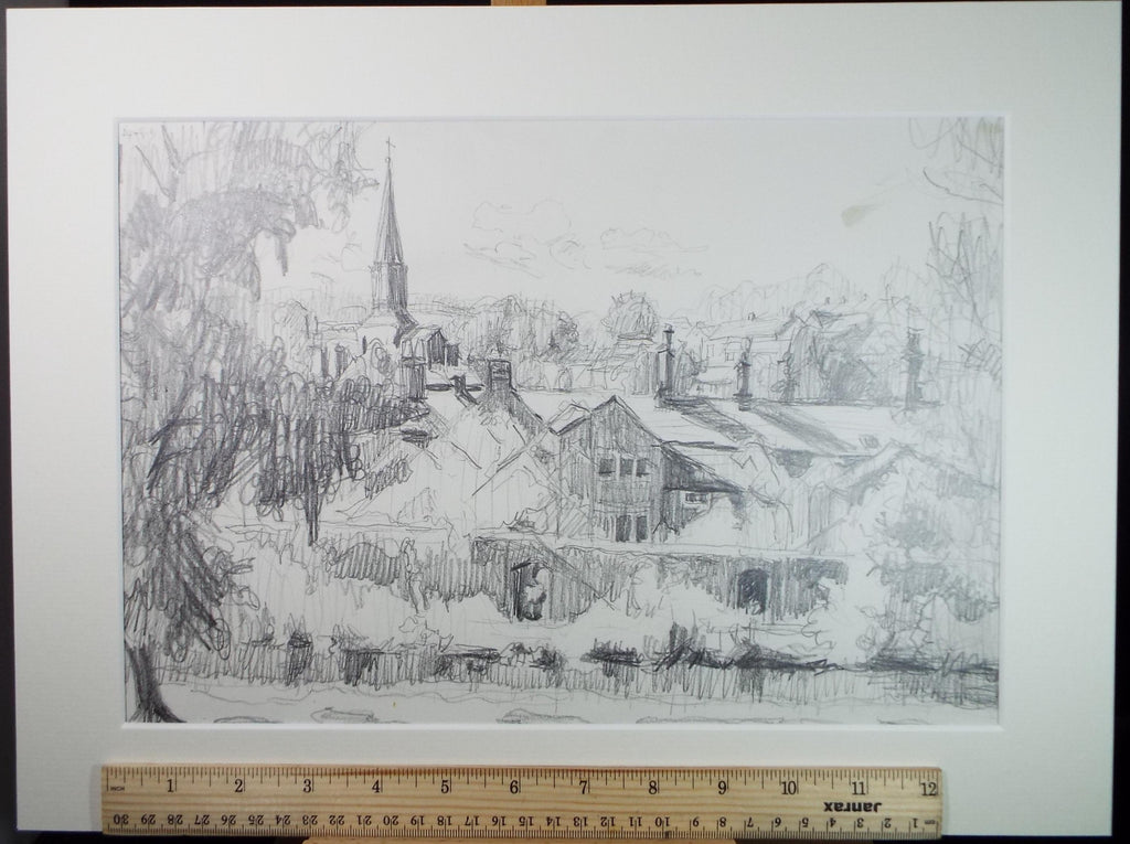 Pencil drawing 'Rooftops with church spire', Pauline Plummer (b1933), Circa 1990's