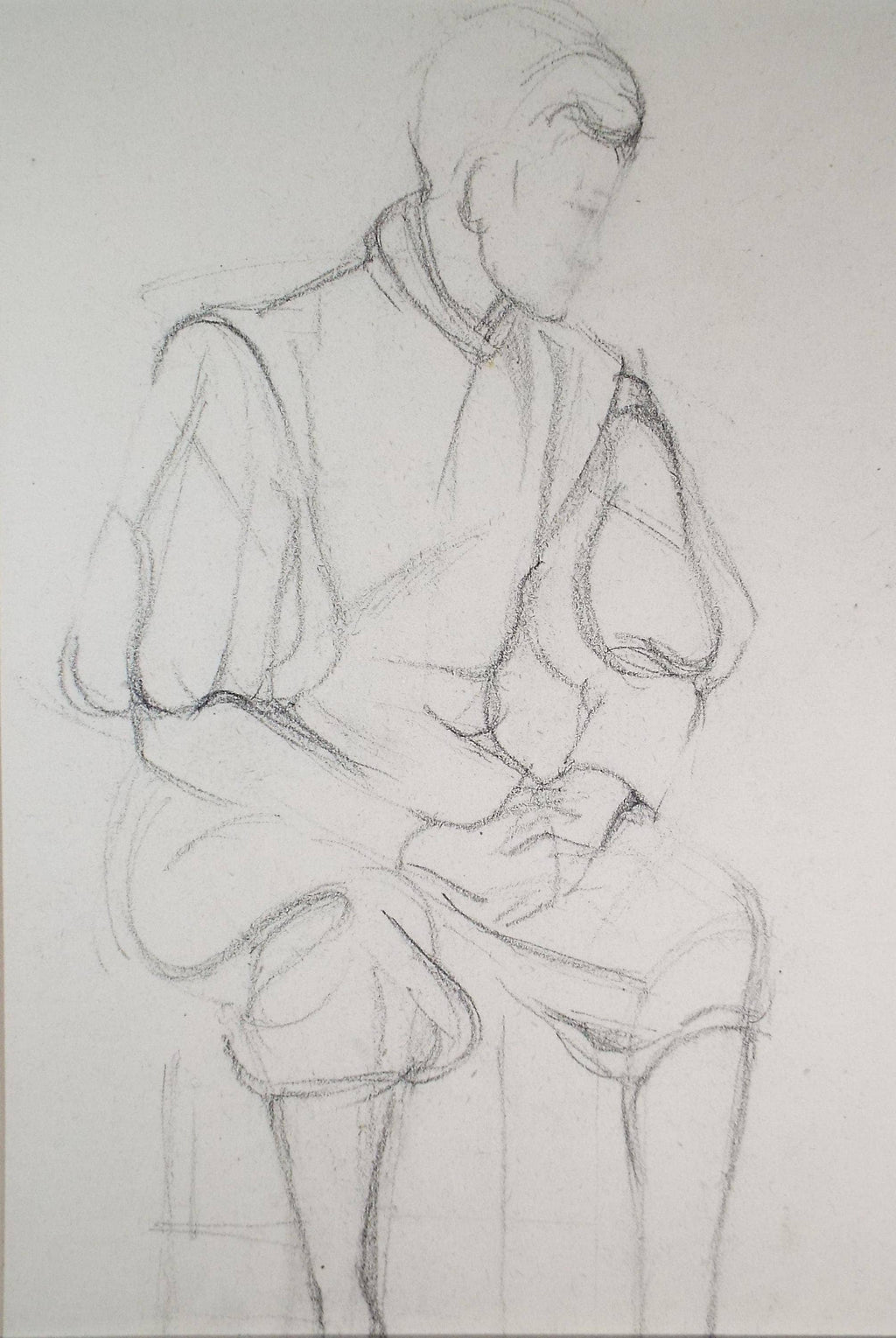Pencil drawing 'Seated figure in Elizabethan dress', c1950s, C.D. Finley
