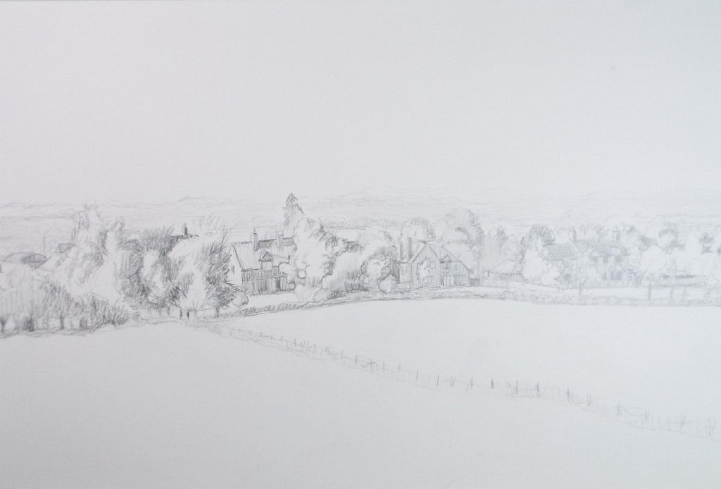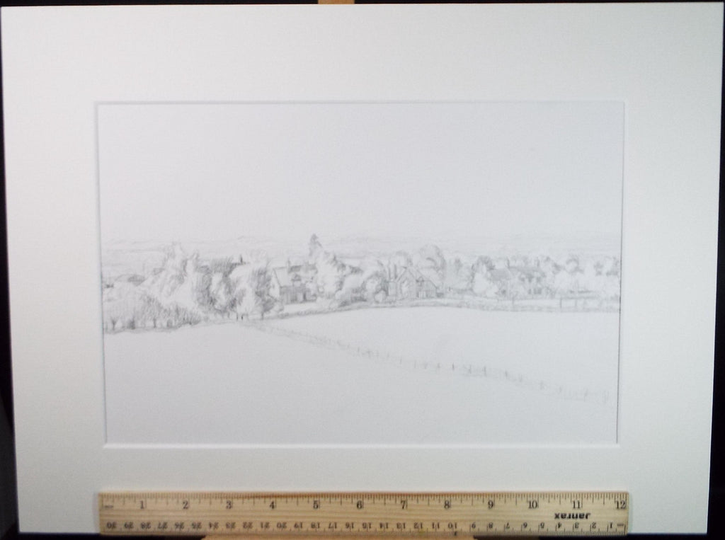 Pencil drawing 'Village in a Landscape', Pauline Plummer (b1933), Circa 1990's